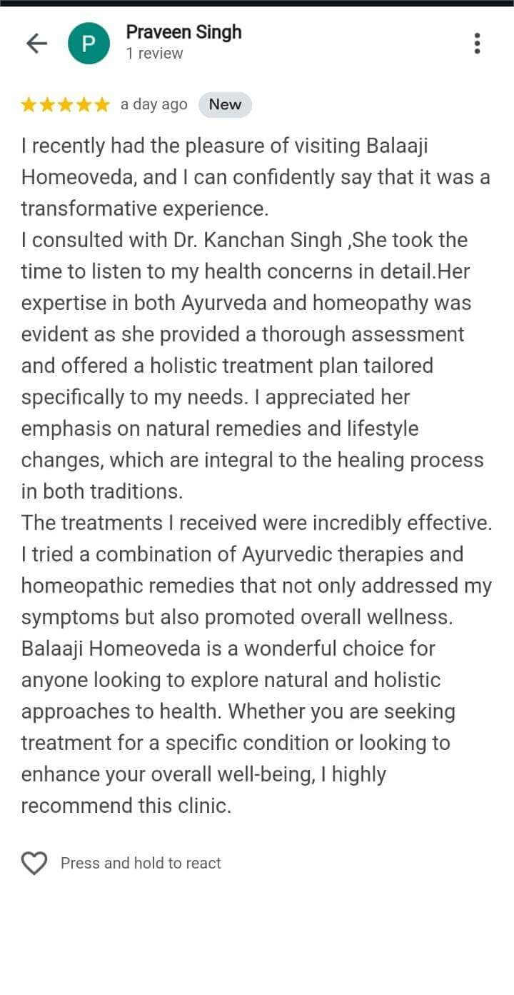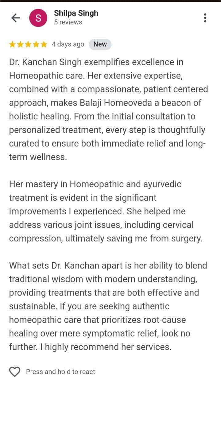 • "Dr.  Kanchan Singh helped me overcome my chronic allergies with homeopathic treatments. I feel healthier and more energetic than ever!"